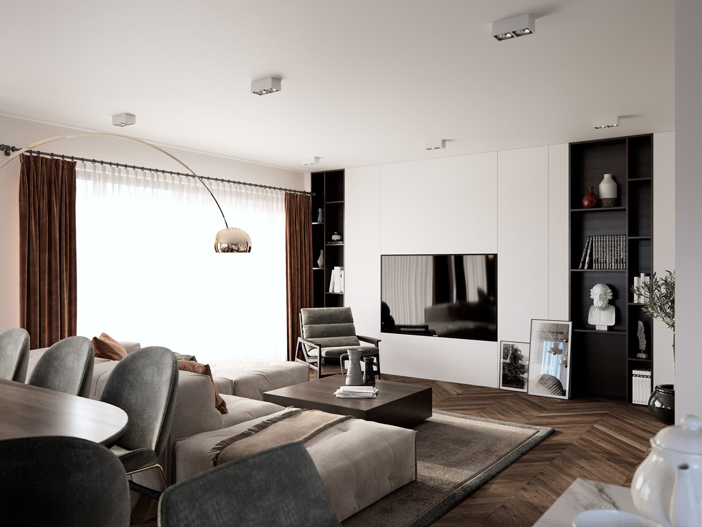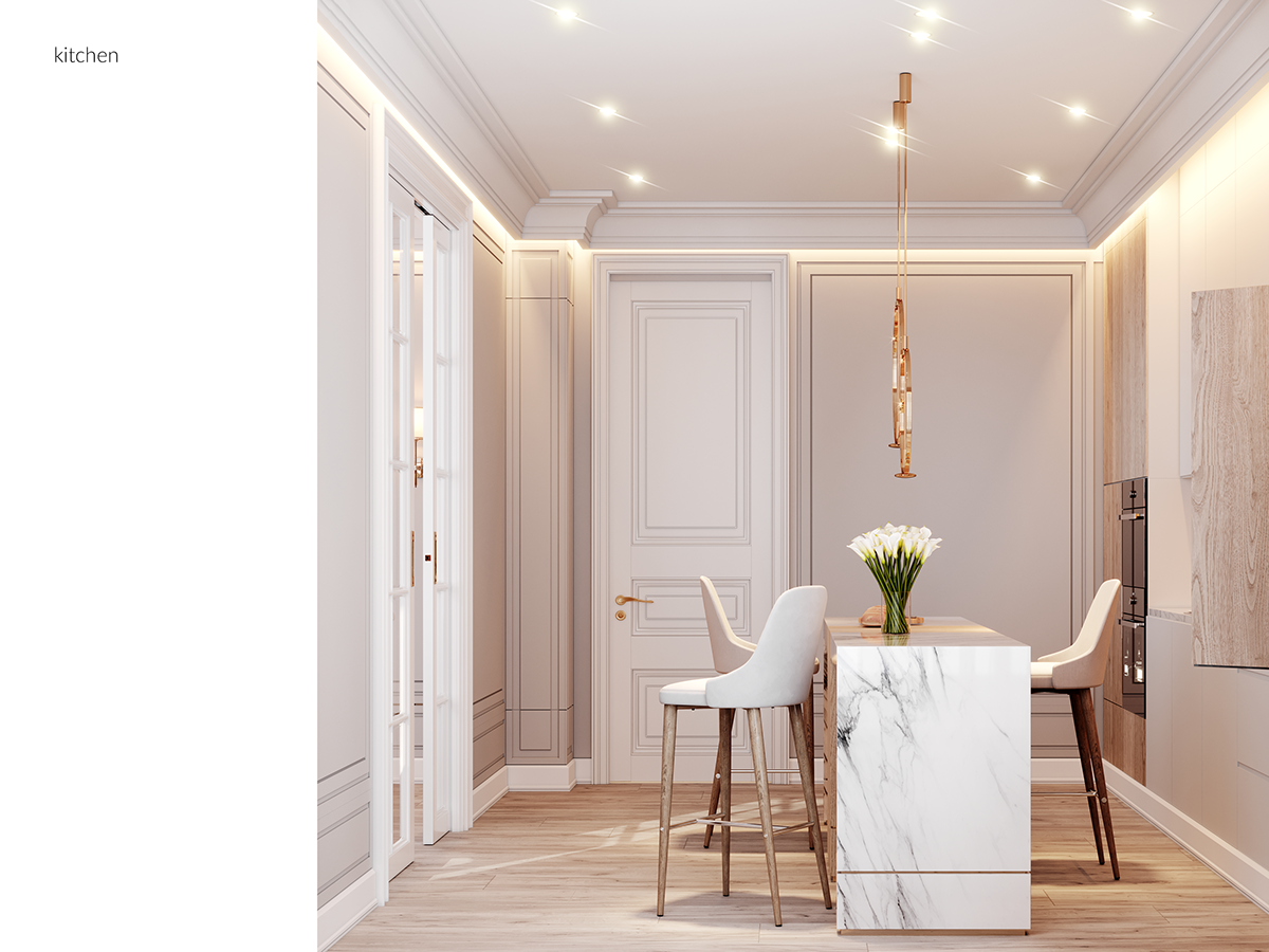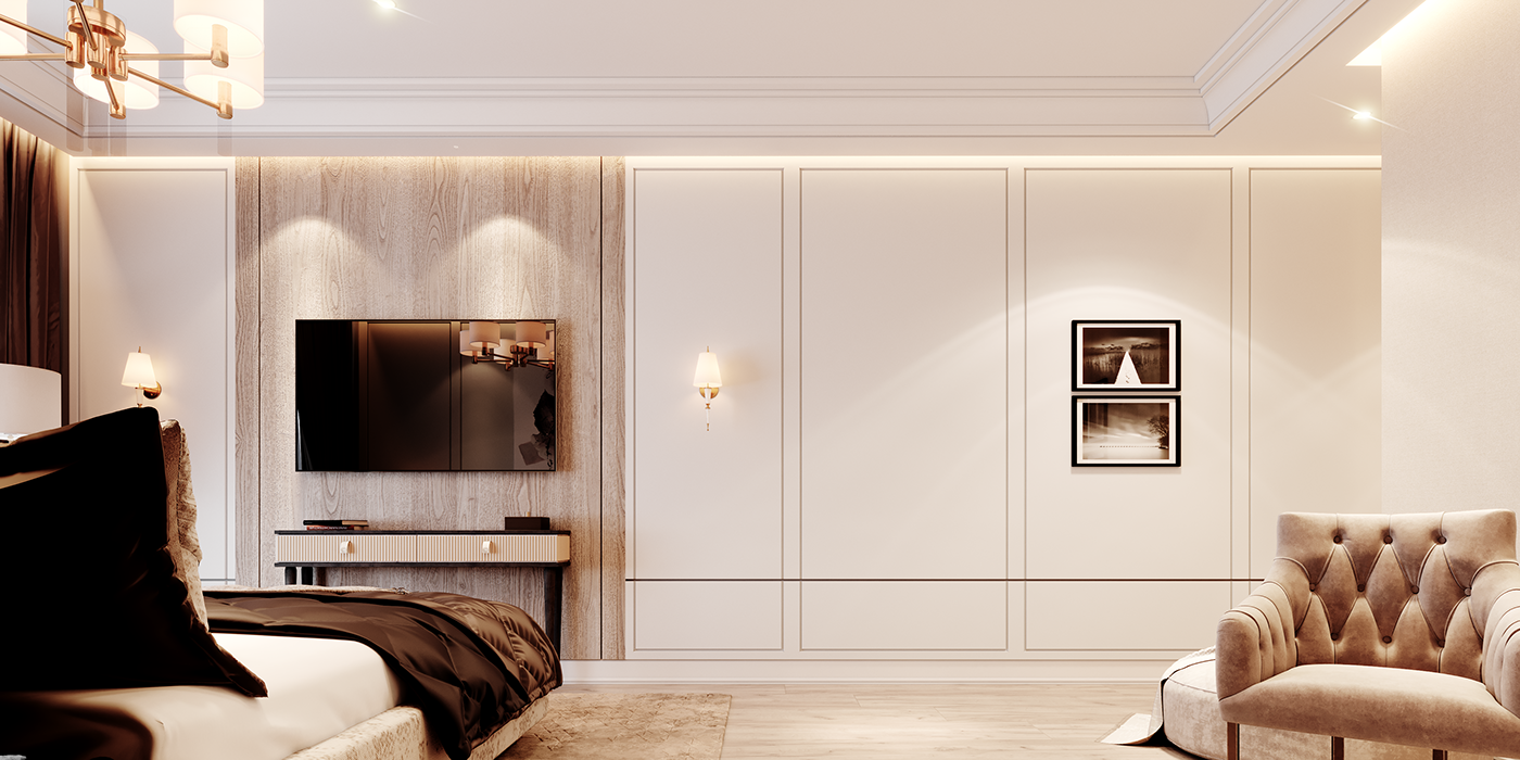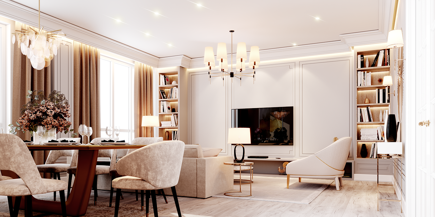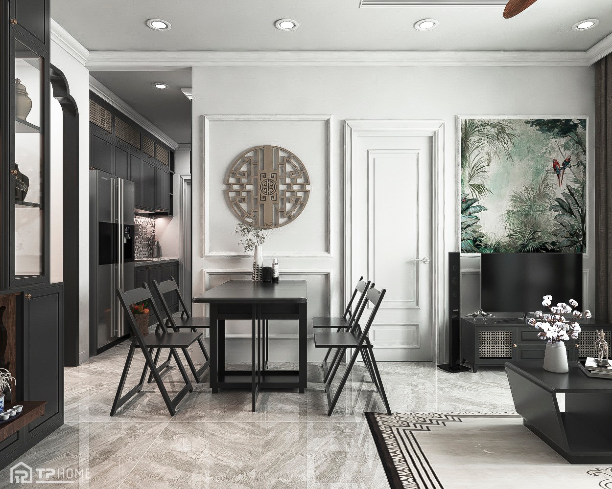 Trái ngược với hai phong cách nội thất tối giản và hiện đại bên trên, phong cách tân cổ điển mang theo nhiều chi tiết rườm rà và phức tạp hơn nhiều. Đây là thiết kế nội thất cho căn hộ Eco Green thích hợp cho các gia chủ yêu thích sự cổ điển nhưng vẫn muốn ứng dụng các chất liệu hiện đại đem đến sự tiện nghi và tiết kiệm chi phí.