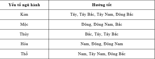 Ngoài ra, quý gia chủ có thể tham khảo các hướng cửa phòng ngũ theo mệnh ngũ hành như bảng dưới đây.