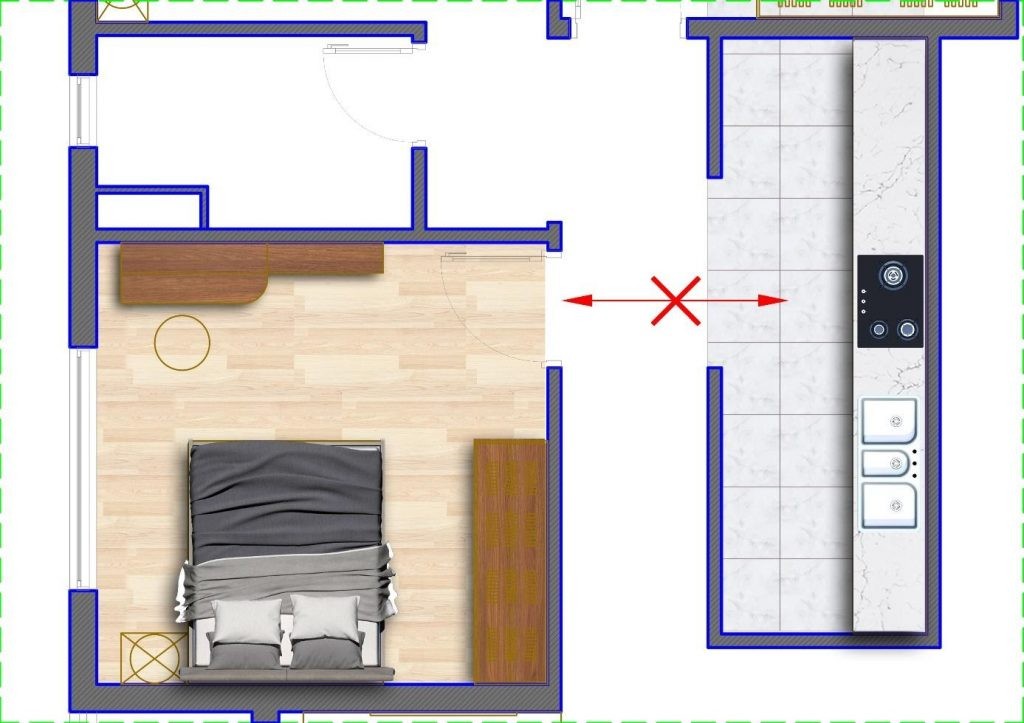 (Không nên thiết kế cửa phòng ngủ đối diện nhà bếp)