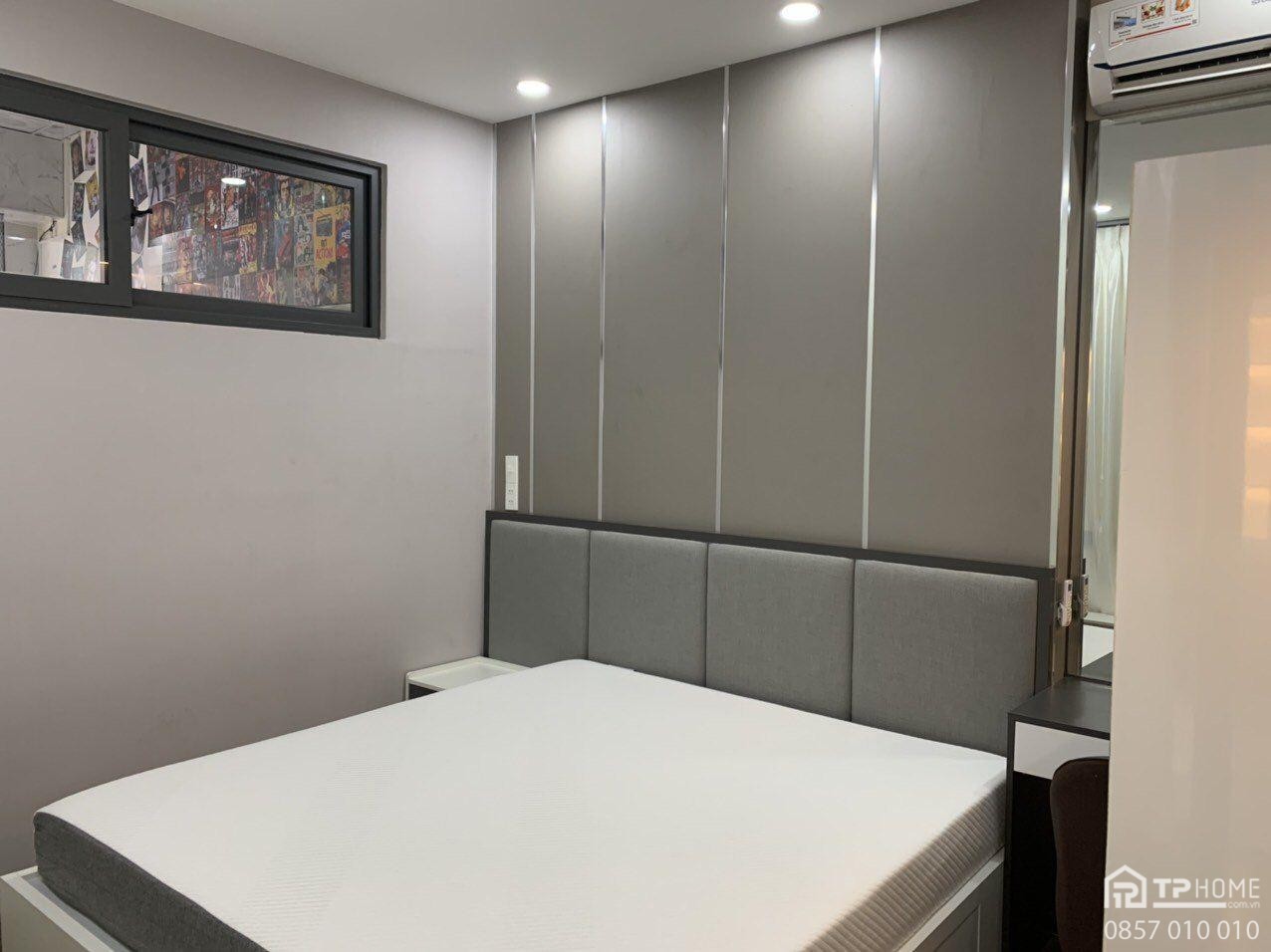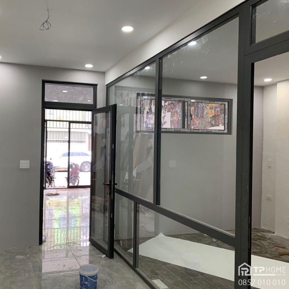 Các cửa nhôm cũng được thay thế bằng cửa kính. Đặc biệt là ở đây, đội ngũ thiết kế của TPHOME đã tận dụng hiệu ứng của của kính, làm vách ngăn giữ 2 phòng ngủ và phòng khách, tạo thành một khối đồng nhất với cửa ra vào, giúp phòng khách dù diện tích khiêm tốn nhưng nhìn vẫn thoáng đãng và rộng rãi.