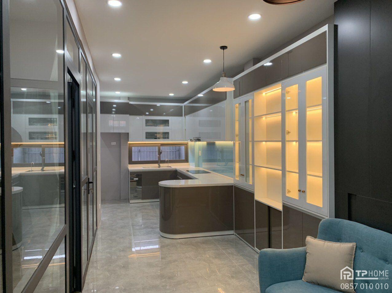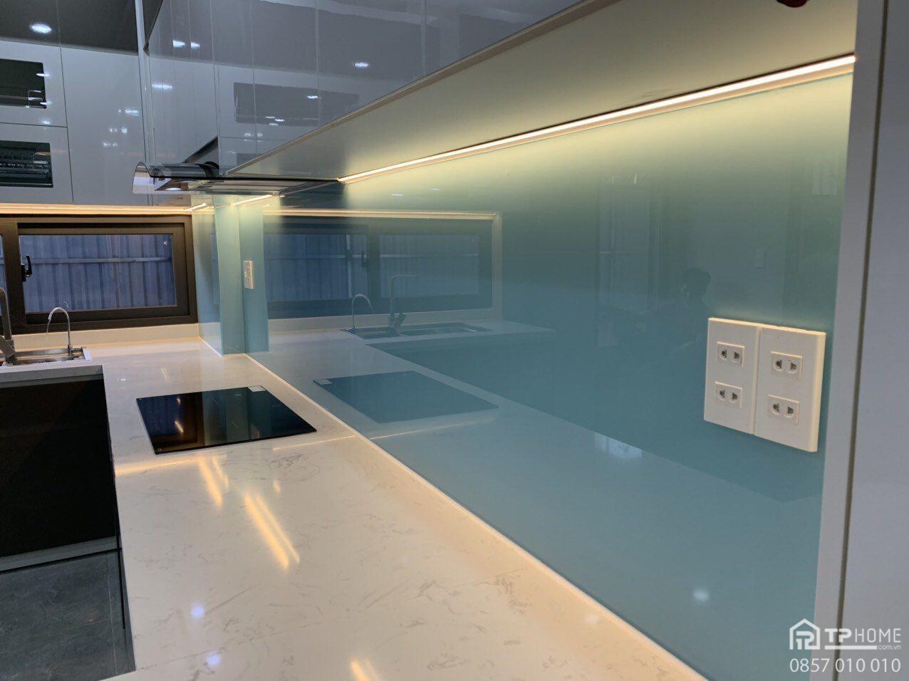 Hệ thống tủ bếp được trang bị đầy đủ các kệ đựng chén, kệ đựng gia vị thông minh, nhằm đem đến sự tiện lợi cho người sử dụng. Các hộc tủ đều được hỗ trợ ray giảm chấn giúp việc đóng mở tủ trở nên nhẹ nhàng, đồng thời tăng độ bền bỉ cho sản phẩm. Phần bếp được gắn thêm kính cường lực sơn màu xanh dương (cùng tông màu sofa) tạo nên sự tinh tế đáng có cho căn nhà.