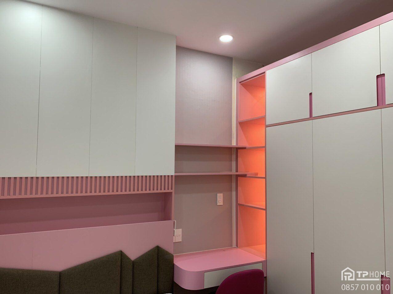 Phòng bé gái cũng có đầy đủ các vật dụng như phòng bố mẹ, tuy nhiên bàn trang điểm sẽ được thay bằng bàn học và sử dụng tông màu hồng để phù hợp với nhu cầu, sở thích của bé.