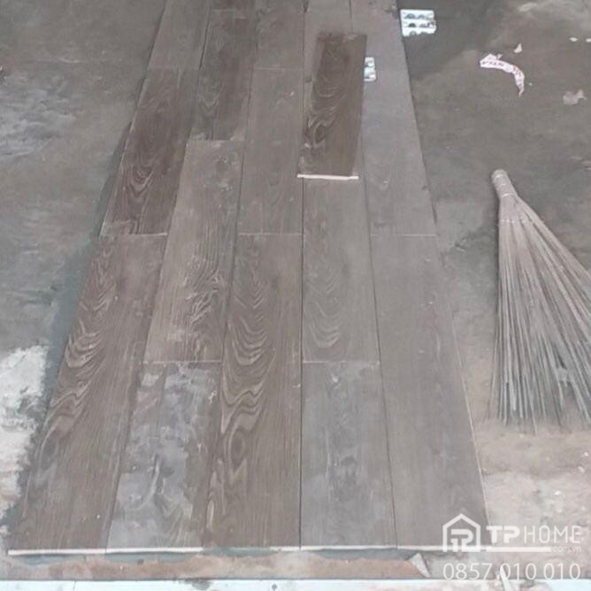 Sàn chia thành 2 khu vực để thi công: Khu vực bếp và phòng khách sử dụng đá nhân tạo vân xám, hai phòng ngủ lót bằng ván gỗ nhân tạo, sơn màu như thiết kế.