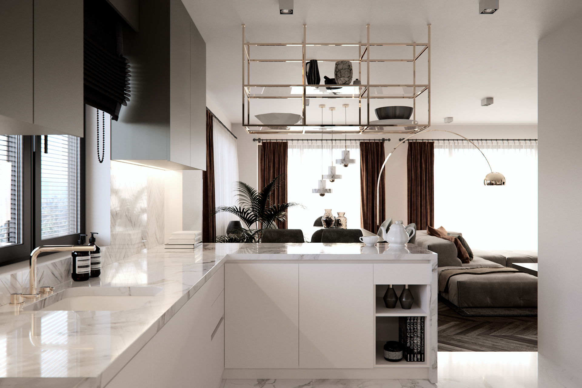 Các không gian mở liên thông với nhau có chủ ý, như phòng khách tiếp tối bếp ăn hoặc được thiết kế “2 trong 1”, kiểu thiết kế này thường được áp dụng nhiều với các ngôi nhà bị hạn chế về diện tích. Phong cách thiết kế nội thất hiện đại giúp các chi tiết đều ăn nhập với nhau, điều này tạo nên cái nhìn tổng thể thông suốt, hợp lý.
