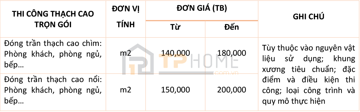5.1. Đơn giá thi công thạch cao trọn gói: