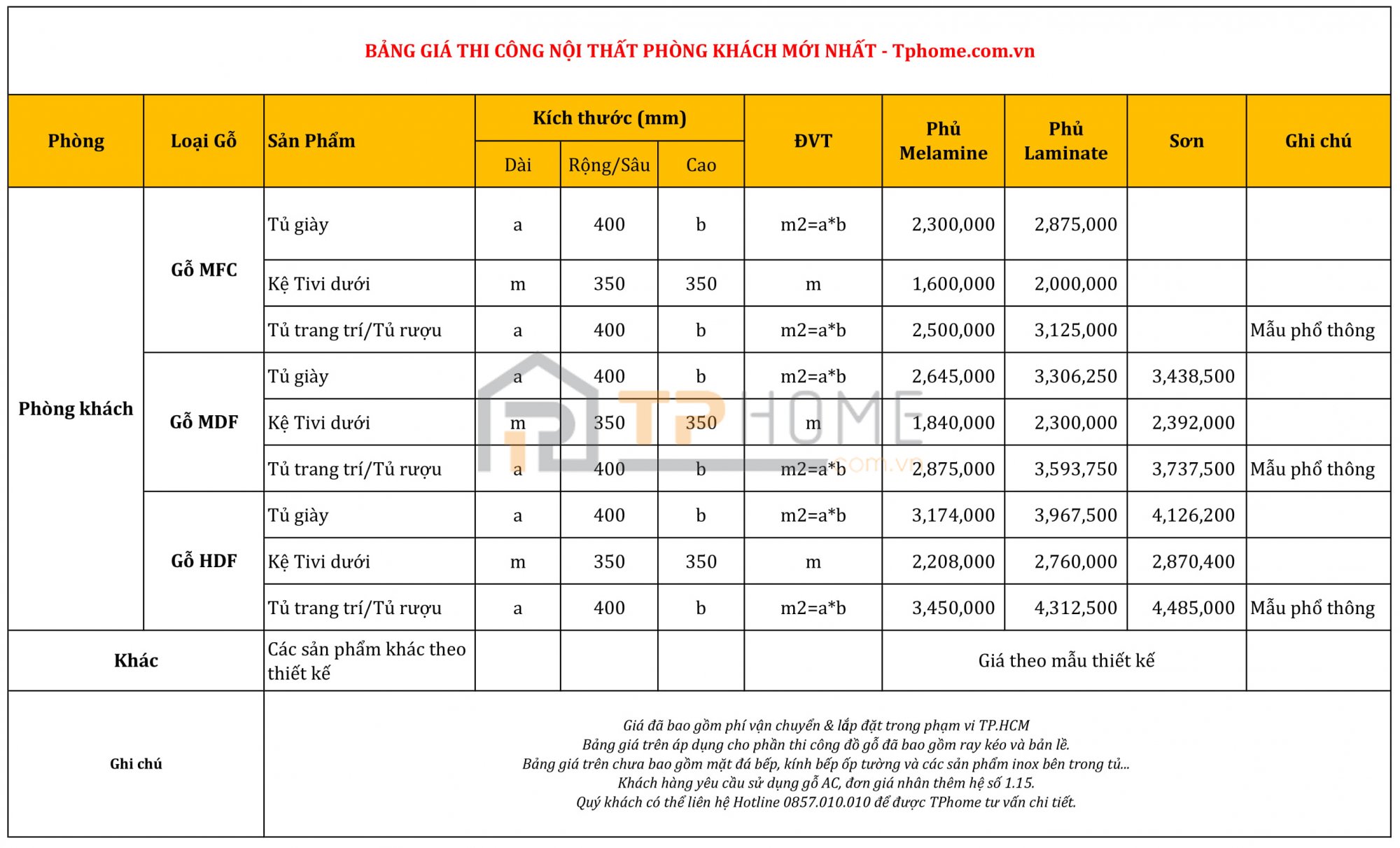 Dưới đây là bảng giá thi công nội thất phòng khách căn hộ theo từng sản phẩm và từng loại gỗ: