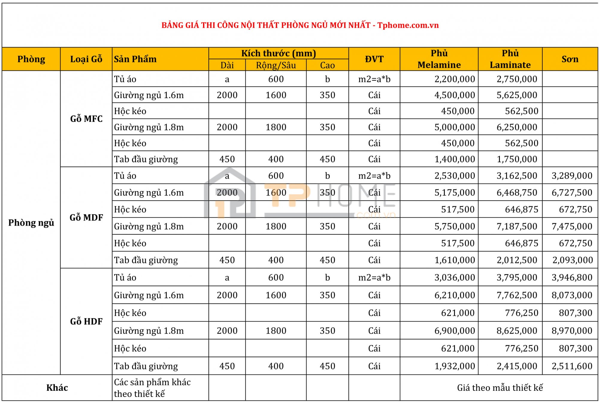 Dưới đây là bảng giá thi công nội thất phòng ngủ căn hộ theo từng sản phẩm và từng loại gỗ: