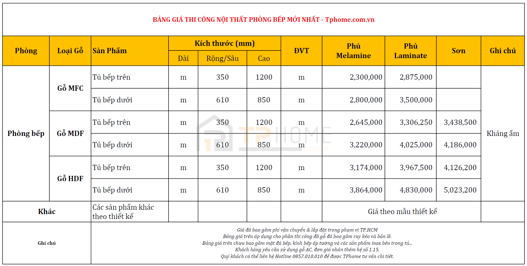 Dưới đây là bảng giá thi công nội thất phòng bếp căn hộ theo từng sản phẩm và từng loại gỗ: